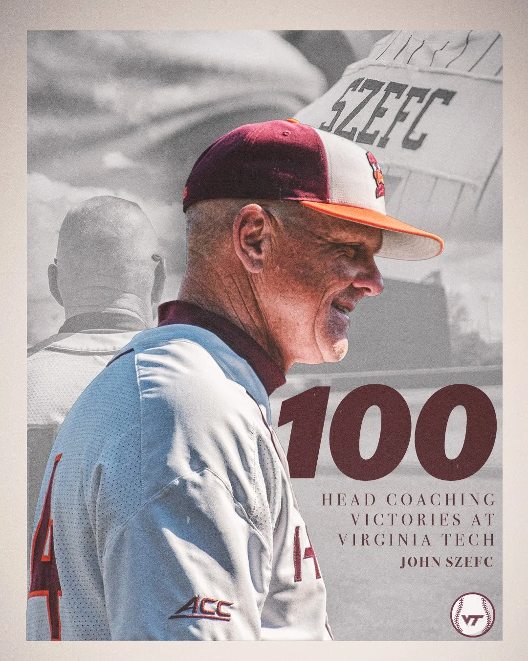 Graphic to celebrate 100 wins as Virginia Tech Head Coach for John Szefc